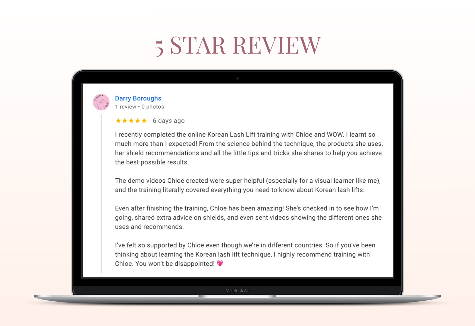 I’ve felt so supported by Chloe even though we’re in different countries. So if you’ve been thinking about learning the Korean lash lift technique, I highly recommend training with Chloe. You won’t be disappointed! 💖